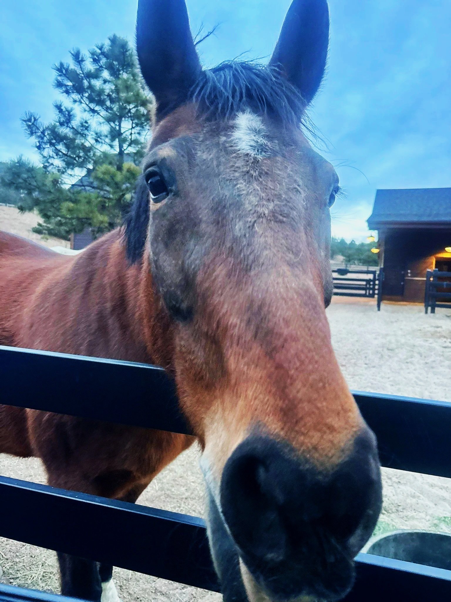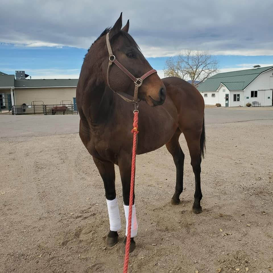 Not Today Satan is a 2015 OTTB gelding who came to us with a bone chip in his knee. He had surgery and rehab with us before being adopted in 2024.
