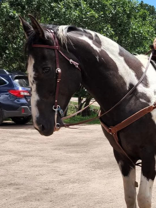 This solid former polo mare is about 17 and has been loving hitting the mountain trails in retirement. She will best be suited fore a confident advanced beginner/intermediate rider.
